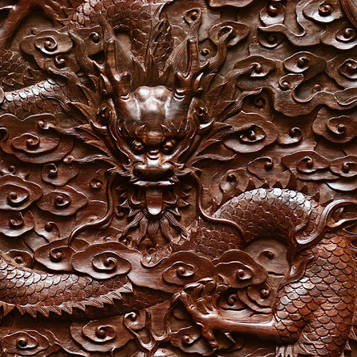 此寶座選用珍貴的大紅酸枝作為原材料,搭腦呈平頭狀,靠背中間高,向兩邊扶手遞減呈梯形。結(jié)構(gòu)設(shè)計巧妙,對稱布局,每個面板皆雕著一條騰飛的金龍,刀法精密,圓潤渾厚;龍紋栩栩如生,云紋舒卷生動,龍的姿態(tài)各異,有的昂首前瞻,有的回首瞭望,動感十足。座面嵌裝硬板,束腰內(nèi)收,雕有纏連枝紋,四條三彎腿做同樣的獸首,足下踩有豐碩的地平,端莊穩(wěn)重。